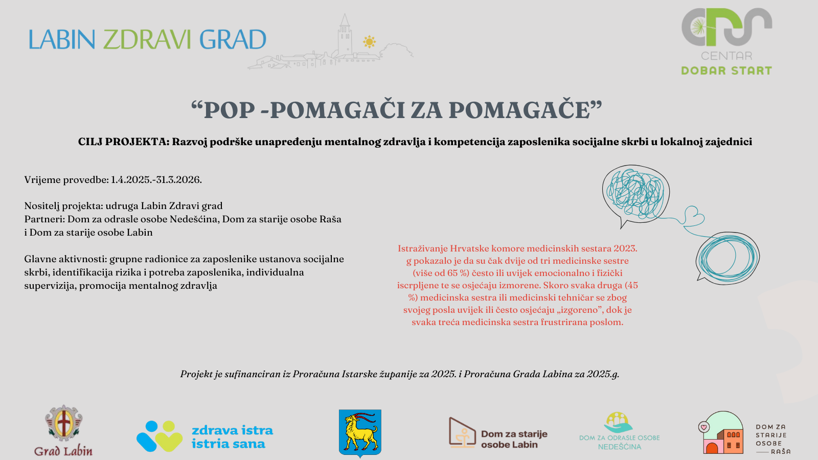 Upravo radi ovih rezultata smo ponosni da smo prepoznali potrebu za provođenjem projekta „POP – Pomagači za pomagače“- kako bi zaposlenici dobili siguran prostor za predah, razmjenu iskustava, ali i razvoj konkretnih alata za svakodnevni rad. Kroz projekt „POP – Pomagači za pomagače“, koji je sufinanciran iz Proračuna Istarske županije za 2025. godinu i Proračuna Grada Labina, od travnja 2025. se provode aktivnosti usmjerene na jačanje otpornosti i mentalnog zdravlja zaposlenih u socijalnoj skrbi.
