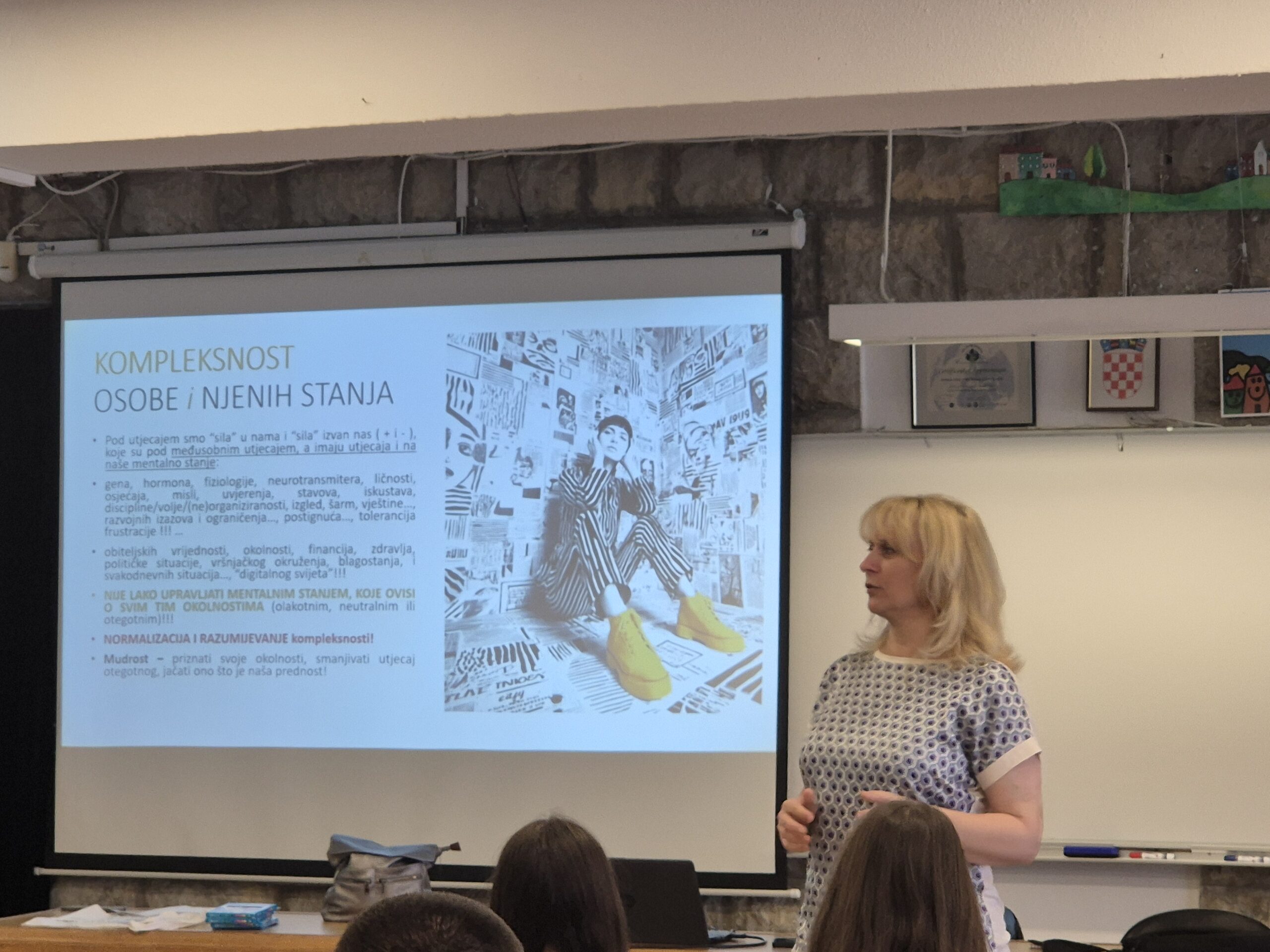 Sudjelovali su učenici 2.-ih razreda različitih usmjerenja, te su im prezentirane teme iz područja mentalnog zdravlja, normalizacije ugodnih i neugodnih emocija, specifičnosti adolescencije, te različitih načina pristupanja podršci samima sebi kako bi osnažili svoju mentalnu dobrobit. Predavanje je bilo usmjereno i na konkretna izazovna životna iskustva, a učenici su imali priliku izraziti svoje stavove i potrebe o temi u radioničkom dijelu.
